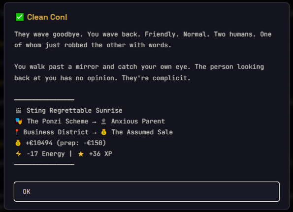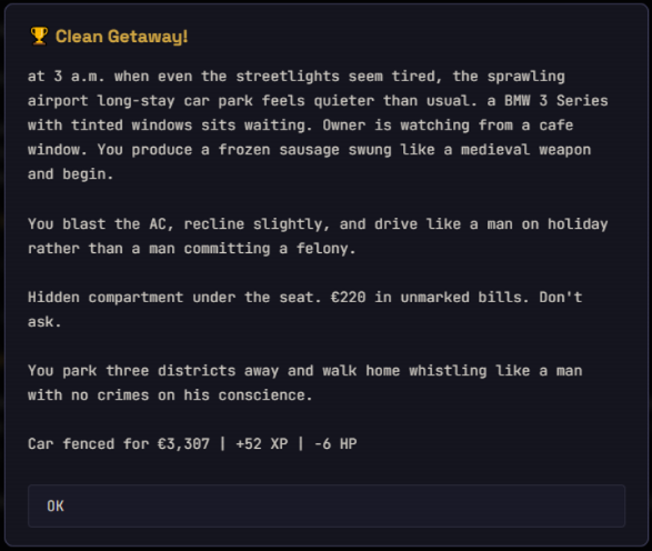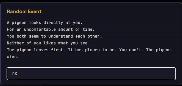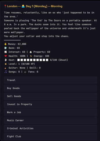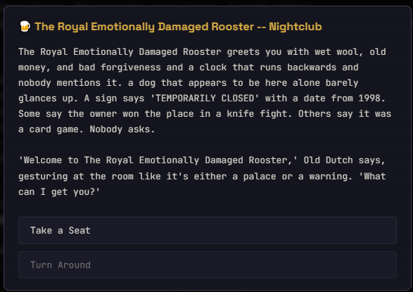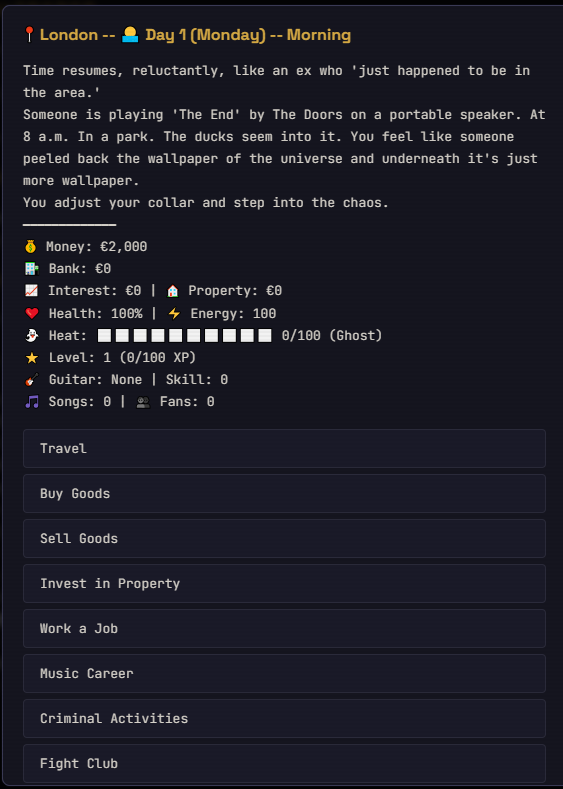 ~17,000 lines of JavaScript later, the experiment had turned into a full system-driven text adventure. No graphics. No external libraries. Just text and decisions.